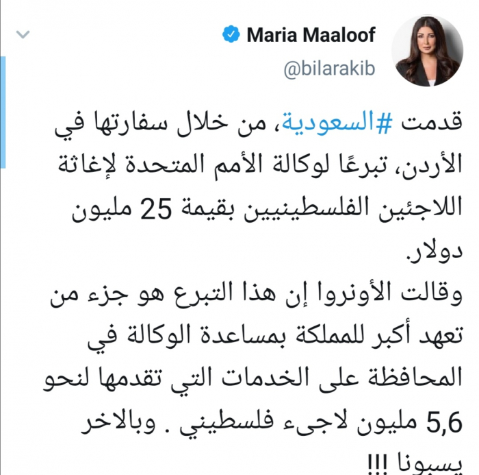 وكتبت معلوف عبر حسابها بتويتر ورصدها "المشهد العربي" قائلة: " قدمت السعودية، من خلال سفارتها في الأردن، تبرعًا لوكالة الأمم المتحدة لإغاثة اللاجئين الفلسطينيين بقيمة 25 مليون دولار".