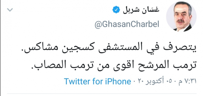 وغرد شربل في تغريدة له عبر حسابه بتويتر ورصدها "المشهد العربي": "يتصرف في المستشفى كسجين مشاكس"، مشيرا إلى أن "ترمب المرشح أقوى من ترمب المصاب".