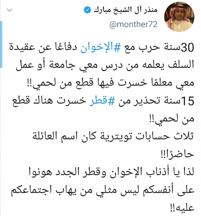 وأضاف: "15سنة تحذير من قطر خسرت هناك قطع من لحمي، ثلاث حسابات تويترية كان اسم العائلة حاضرًا، لذا يا أذناب الإخوان وقطر الجدد هونوا على أنفسكم ليس مثلي من يهاب اجتماعكم عليه".