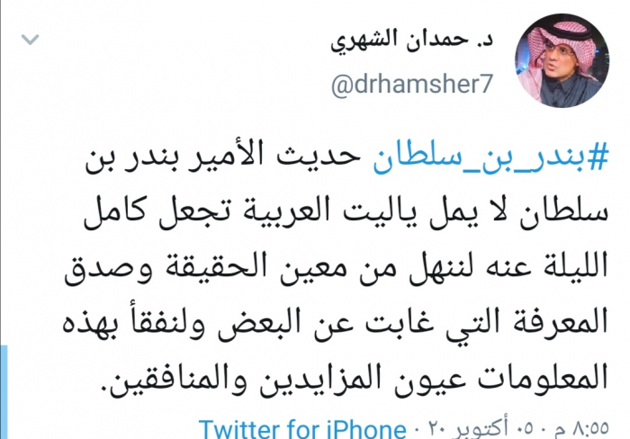وقال الشهري في تغريدة له عبر حسابه بتويتر ورصدها "المشهد العربي": "حديث الأمير بندر بن سلطان لا يمل ياليت العربية تجعل كامل الليلة عنه لننهل من معين الحقيقة وصدق المعرفة التي غابت عن البعض ولنفقأ بهذه المعلومات عيون المزايدين والمنافقين".