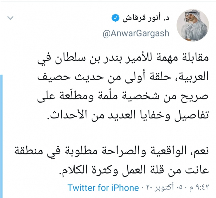 وكتب قرقاش عبر حسابه بتويتر ورصدها "المشهد العربي": "مقابلة مهمة للأمير بندر بن سلطان في العربية، حلقة أولى من حديث حصيف صريح من شخصية ملّمة ومطلّعة على تفاصيل وخفايا العديد من الأحداث".