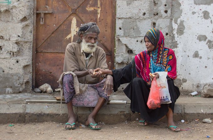 وتظهر الصورة المرأة العجوز، وهي تقاسم الرجل المسن رغيف العيش، في موقف مؤثر، يعكس جانب من الازمة الانسانية في اليمن، التي تسببت فيها ميليشيا الحوثي منذ انقلابها على السلطة الشرعية واشعال الحرب في البلاد.