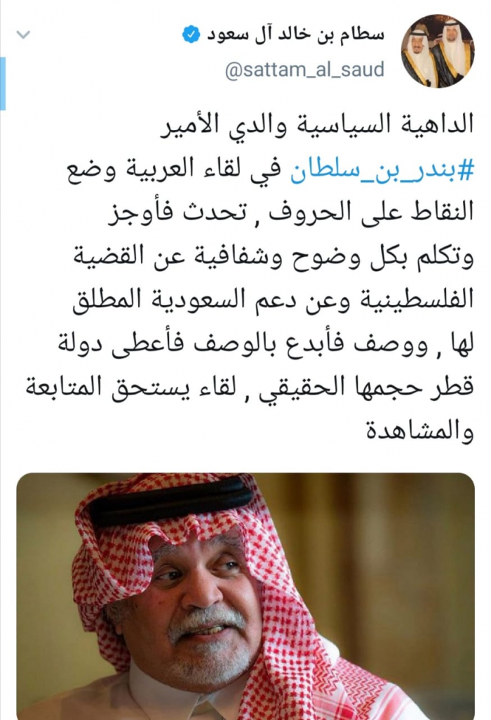 وقال الأمير سلطام: "الداهية السياسية والدي الأمير بندر بن سلطان في لقاء العربية وضع النقاط على الحروف، تحدث فأوجز وتكلم بكل وضوح وشفافية عن القضية الفلسطينية وعن دعم السعودية المطلق لها".