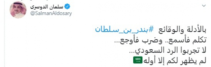 وقال في تغريدة عبر "تويتر" رصدها "المشهد العربي": "بالأدلة والوقائع بندر بن سلطان تكلم فأسمع.. وضرب فأوجع… لا تجربوا الرد السعودي… لم يظهر لكم إلا أوله".