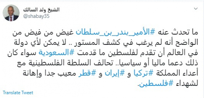 وقال في تغريدة عبر "تويتر" رصدها "المشهد العربي": "ما تحدث عنه الأمير بندر بن سلطان غيض من فيض من الواضح أنه لم يرغب في كشف المستور".