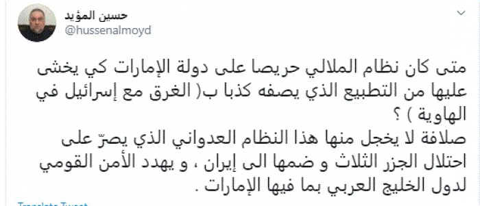 وقال في تغريدة عبر "تويتر" رصدها "المشهد العربي": "متى كان نظام الملالي حريصا على دولة الإمارات كي يخشى عليها من التطبيع الذي يصفه كذبا بـ( الغرق مع إسرائيل في الهاوية)؟".