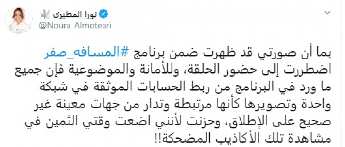 وقالت في تغريدة عبر "تويتر" رصدها "المشهد العربي": "بما أن صورتي قد ظهرت ضمن برنامج المسافه صفر اضطررت إلى حضور الحلقة".