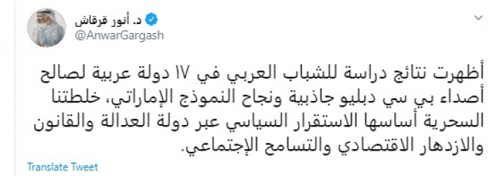 وقال في تغريدة عبر "تويتر" رصدها "المشهد العربي": "أظهرت نتائج دراسة للشباب العربي في ١٧ دولة عربية لصالح أصداء بي سي دبليو جاذبية ونجاح النموذج الإماراتي، خلطتنا السحرية أساسها الاستقرار السياسي عبر دولة العدالة والقانون والازدهار الاقتصادي والتسامح الاجتماعي".