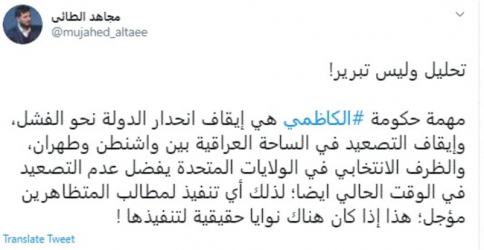 وكتب في تغريدة عبر "تويتر" رصدها "المشهد العربي": "تحليل وليس تبرير! مهمة حكومة الكاظمي هي إيقاف انحدار الدولة نحو الفشل، وإيقاف التصعيد في الساحة العراقية بين واشنطن وطهران، والظرف الانتخابي في الولايات المتحدة يفضل عدم التصعيد في الوقت الحالي أيضا؛ لذلك أي تنفيذ لمطالب المتظاهرين مؤجل؛ هذا إذا كان هناك نوايا حقيقية لتنفيذها".