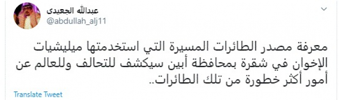 وكتب في تغريدة عبر "تويتر" رصدها "المشهد العربي": "معرفة مصدر الطائرات المُسيرة التي استخدمتها مليشيات الإخوان في شقرة بمحافظة أبين سيكشف للتحالف وللعالم عن أمور أكثر خطورة من تلك الطائرات".