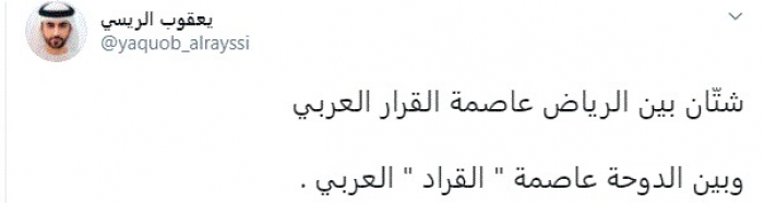 وقال في تغريدة عبر "تويتر" رصدها "المشهد العربي": "شتّان بين الرياض عاصمة القرار العربي وبين الدوحة عاصمة القراد العربي".