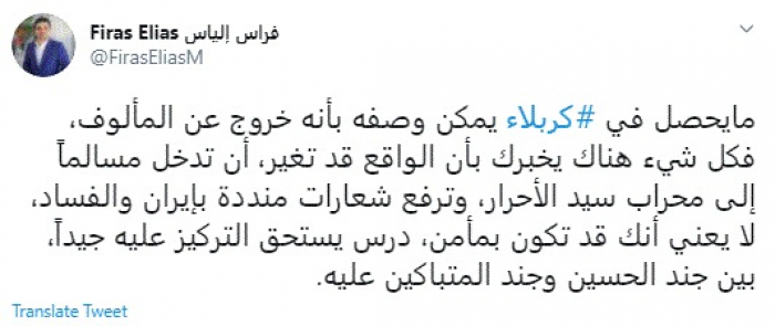 وكتب في تغريدة عبر "تويتر" رصدها "المشهد العربي": "ما يحصل في كربلاء يمكن وصفه بأنه خروج عن المألوف، فكل شيء هناك يخبرك بأن الواقع قد تغير، أن تدخل مسالماً إلى محراب سيد الأحرار، وترفع شعارات منددة بإيران والفساد، لا يعني أنك قد تكون بمأمن، درس يستحق التركيز عليه جيداً، بين جند الحسين وجند المتباكين عليه".