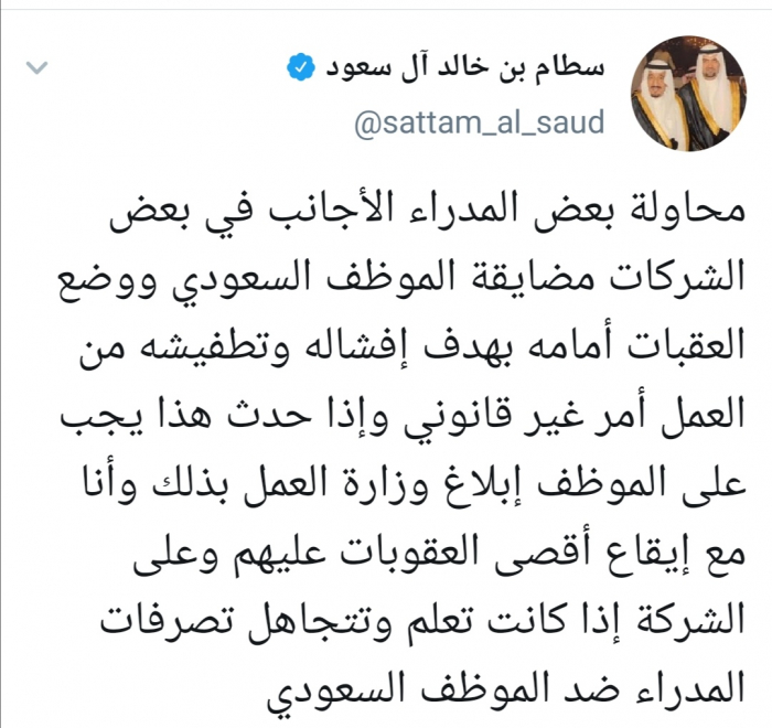 استنكر الأمير السعودي سطام بن خالد آل سعود، توجه بعض الشركات لمضايقة الموظفين السعوديين ووضع العقبات أمامهم بهدف إفشالهم وتطفيشهم من العمل.