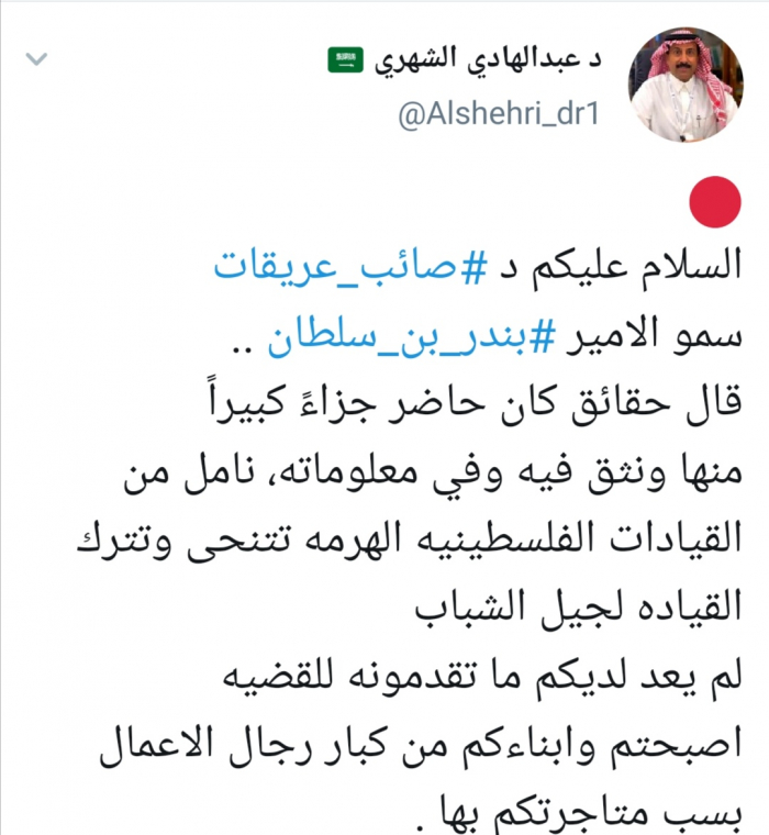 وكتب الشهري عبر تغريدة له على "تويتر" رصدها " المشهد العربي": "نامل من القيادات الفلسطينية الهرمة تتنحى وتترك القياده لجيل الشباب" قائلاً:" لم يعد لديكم ما تقدمونه للقضية".