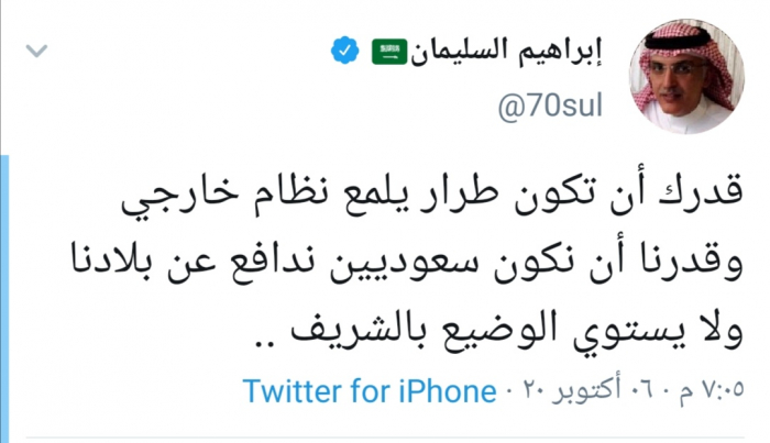 وكتب السليمان في تغريدة له عبر "تويتر" رصدها "المشهد العربي": "قدرك أن تكون طرار يلمع نظام خارجي وقدرنا أن نكون سعوديين ندافع عن بلادنا ولا يستوي الوضيع بالشريف".