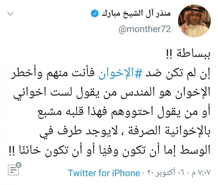 وكتب آل شيخ المبارك عبر تغريدة له على "تويتر" رصدها " المشهد العربي": " ‏ببساطة، إن لم تكن ضد ‎الإخوان فأنت منهم وأخطر الإخوان هو المندس من يقول لست إخواني أو من يقول احتووهم فهذا قلبه مشبع بالإخوانية الصرفة" .