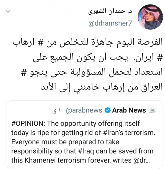وقال الشهري في تغريدة له عبر حسابه بتويتر ورصدها "المشهد العربي": "الفرصة اليوم جاهزة للتخلص من إرهاب إيران".
