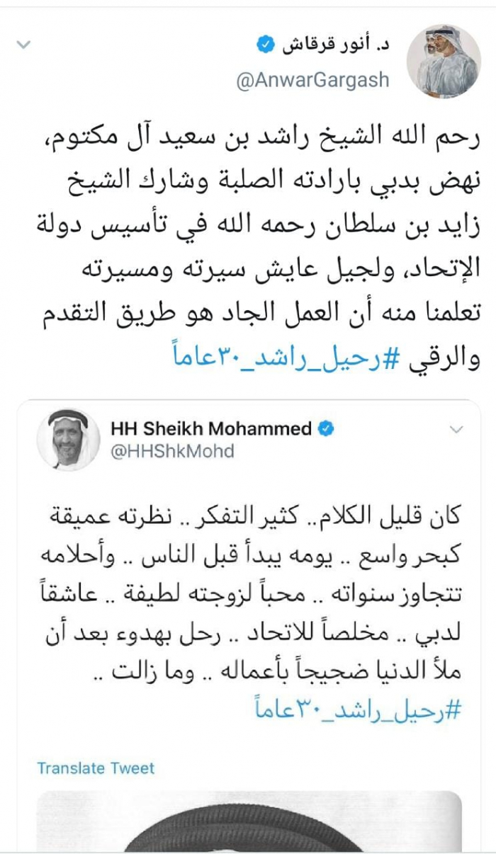 وقال قرقاشي في تغريدة عبر "تويتر" رصدها "المشهد العربي": "رحم الله الشيخ راشد بن سعيد آل مكتوم، نهض بدبي بإرادته الصلبة وشارك الشيخ زايد بن سلطان رحمه الله في تأسيس دولة الاتحاد، ولجيل عايش سيرته ومسيرته تعلمنا منه أن العمل الجاد هو طريق التقدم والرقي".