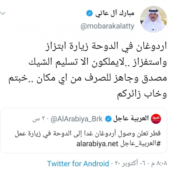 وكتب آل عاتي عبر تغريدة له على "تويتر" رصدها " المشهد العربي": "أردوغان في الدوحة زيارة ابتزاز واستفزاز" .