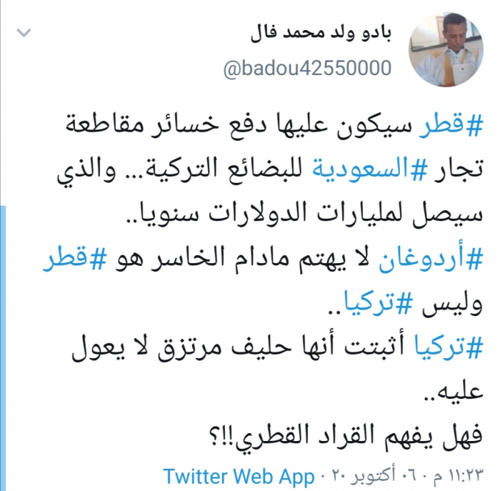 وأشار الكاتب الموريتاني إلى أن أردوغان لا يهتم مادام الخاسر هو قطر وليس تركيا، مختتما تغريدته:"تركيا أثبتت أنها حليف مرتزق لا يعول عليه" متسائلا: هل يفهم القراد القطري؟.