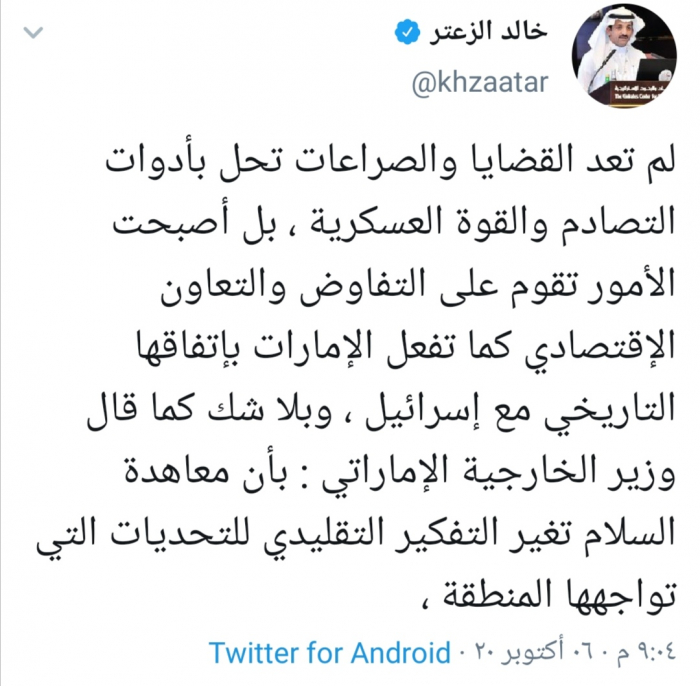 وكتب الزعتر عبر تغريدة له على "تويتر" رصدها "المشهد العربي": "لم تعد القضايا والصراعات تحل بأدوات التصادم والقوة العسكرية ، بل أصبحت الأمور تقوم على التفاوض والتعاون الإقتصادي".