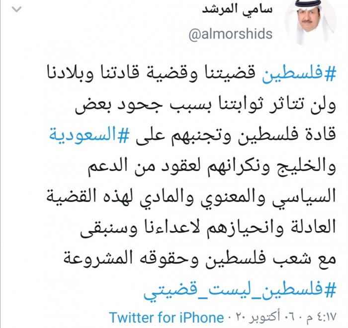 وأضاف المرشد في تغريدة له عبر حسابه بتويتر ورصدها "المشهد العربي" أن "تجنيهم على السعودية والخليج ونكرانهم لعقود من الدعم السياسي والمعنوي والمادي لهذه القضية العادلة وانحيازهم لاعداءنا لكن سنبقى مع شعب فلسطين وحقوقه المشروعة".