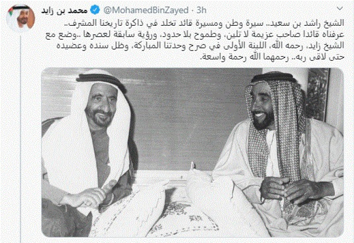 وكتب في تغريدة عبر "تويتر" رصدها "المشهد العربي": "الشيخ راشد بن سعيد.. سيرة وطن ومسيرة قائد تخلد في ذاكرة تاريخنا المشرف.. عرفناه قائدا صاحب عزيمة لا تلين، وطموح بلا حدود، ورؤية سابقة لعصرها.. وضع مع الشيخ زايد، رحمه الله، اللبنة الأولى في صرح وحدتنا المباركة، وظل سنده وعضيده حتى لاقى ربه.. رحمهما الله رحمة واسعة".