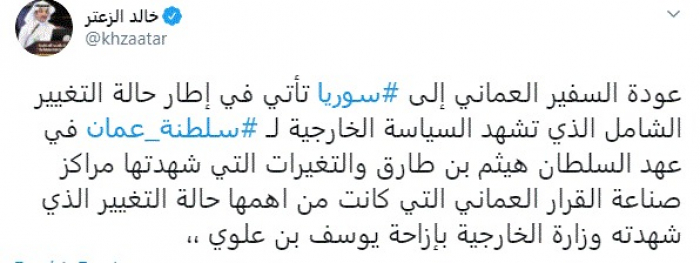وقال في تغريدة عبر "تويتر" رصدها "المشهد العربي": "عودة السفير العماني إلى سوريا تأتي في إطار حالة التغيير الشامل الذي تشهد السياسة الخارجية لـ سلطنة عمان في عهد السلطان هيثم بن طارق والتغيرات التي شهدتها مراكز صناعة القرار العماني التي كانت من أهمها حالة التغيير الذي شهدته وزارة الخارجية بإزاحة يوسف بن علوي".