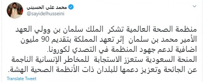 وكتب في تغريدة عبر "تويتر" رصدها "المشهد العربي": "منظمة الصحة العالمية تشكر الملك سلمان بن وولي العهد الأمير محمد بن سلمان إثر تعهد المملكة بتقديم 90 مليون اضافية لدعم جهود المنظمة في التصدي لكورونا".