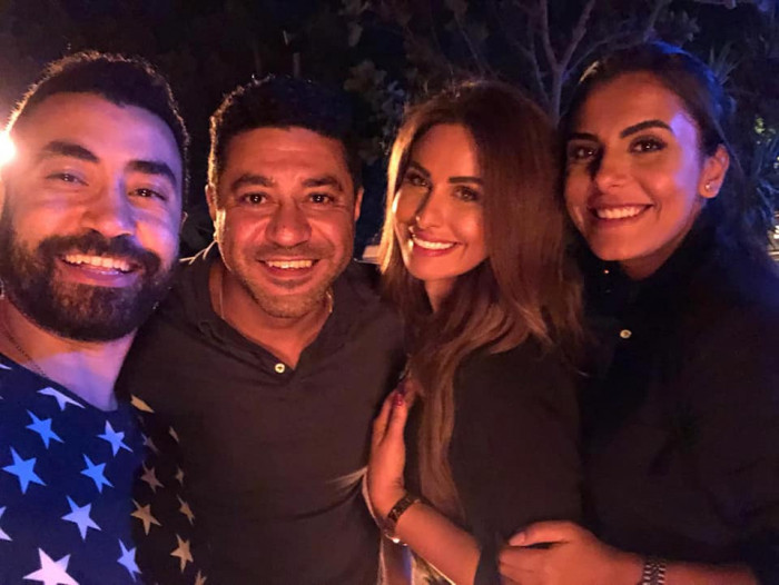 وظهر معه بالصورة الفنان محمد عز والفنانة مي سليم أبطال العمل.