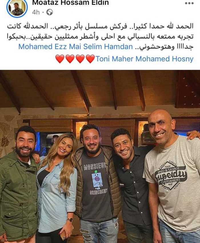 وكتب:"الحمد لله حمدا كثيرا.. فركش مسلسل بأثر رجعي.. الحمدلله كانت تجربه ممتعه بالنسبالي مع احلى وأشطر ممثليين حقيقين..بحبكوا جداااا وهتوحشوني".