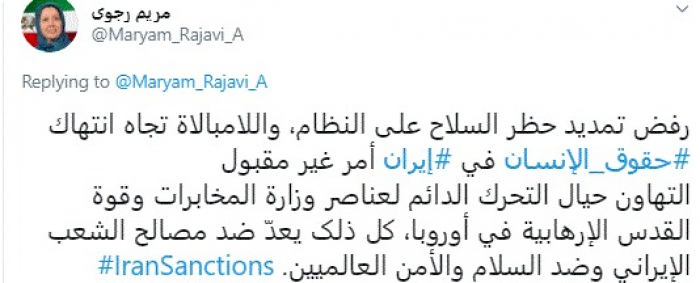وأضافت: "رفض تمديد حظر السلاح على النظام، واللامبالاة تجاه انتهاك حقوق الإنسان في إيران أمر غير مقبول التهاون حيال التحرك الدائم لعناصر وزارة المخابرات وقوة القدس الإرهابية في أوروبا، کل ذلک یعدّ ضد مصالح الشعب الإيراني وضد السلام والأمن العالميين".