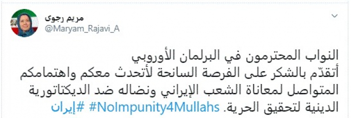 وكتبت في تغريدات عبر "تويتر" رصدها "المشهد العربي": "النواب المحترمون في البرلمان الأوروبي أتقدّم بالشكر على الفرصة السانحة لأتحدث معكم واهتمامکم المتواصل لمعاناة الشعب الإيراني ونضاله ضد الديكتاتورية الدينية لتحقيق الحرية".