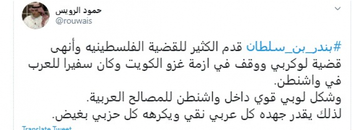 وكتب في تغريدة عبر "تويتر" رصدها "المشهد العربي": "بندر بن سلطان قدم الكثير للقضية الفلسطينيه وأنهى قضية لوكربي ووقف في ازمة غزو الكويت وكان سفيرا للعرب في واشنطن".