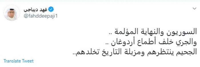 وقال في تغريدة عبر "تويتر" رصدها "المشهد العربي": "السوريون والنهاية المؤلمة.. والجري خلف أطماع أردوغان.. الجحيم ينتظرهم ومزبلة التاريخ تخلدهم".