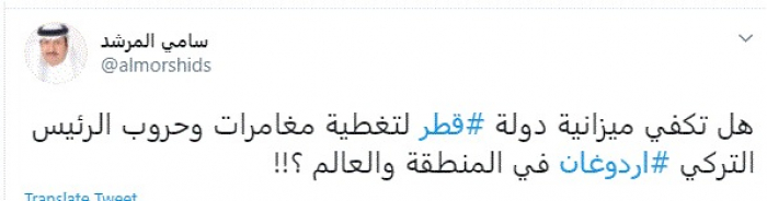 وقال في تغريدة عبر "تويتر" رصدها "المشهد العربي": "هل تكفي ميزانية دولة قطر لتغطية مغامرات وحروب الرئيس التركي أردوغان في المنطقة والعالم؟".