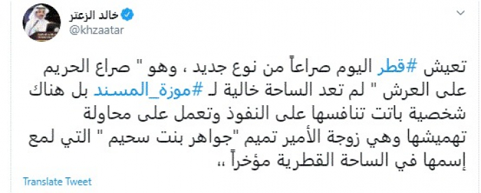 وقال في تغريدة عبر "تويتر" رصدها "المشهد العربي": "تعيش قطر اليوم صراعاً من نوع جديد، وهو صراع الحريم على العرش لم تعد الساحة خالية لموزة المسند بل هناك شخصية باتت تنافسها على النفوذ وتعمل على محاولة تهميشها وهي زوجة الأمير تميم جواهر بنت سحيم التي لمع اسمها في الساحة القطرية مؤخراً".