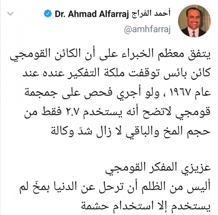 وأوضح الفراج أنه" لو أجري فحص على جمجمة قومجي لاتضح أنه يستخدم 2.7 فقط من حجم المخ والباقي لا زال شدّ وكالة".