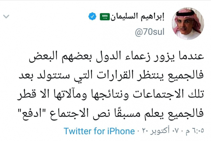 وكتب السليمان في تغريدة له عبر "تويتر" رصدها "المشهد العربي": "عندما يزور زعماء الدول بعضهم البعض فالجميع ينتظر القرارات التي ستتولد بعد تلك الاجتماعات ونتائجها ومآلاتها إلا قطر فالجميع يعلم مسبقًا نص الاجتماع "ادفع".