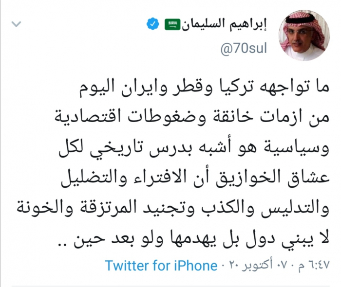 وكتب السليمان في تغريدة له عبر "تويتر" رصدها "المشهد العربي": "ما تواجهه تركيا وقطر وإيران اليوم من أزمات خانقة وضغوطات اقتصادية وسياسية هو أشبه بدرس تاريخي لكل عشاق...".