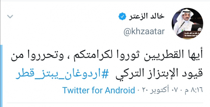 وكتب الزعتر عبر تغريدة له على "تويتر" رصدها "المشهد العربي": "أيها القطريين ثوروا لكرامتكم، وتحرروا من قيود الإبتزاز التركي".
