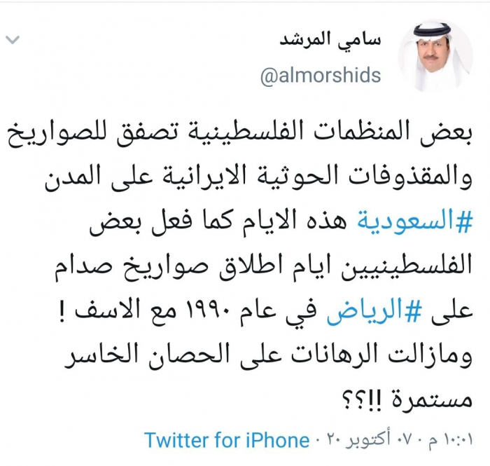 وقال المرشد في تغريدة له عبر حسابه بتويتر ورصدها "المشهد العربي": "بعض المنظمات الفلسطينية تصفق للصواريخ والمقذوفات الحوثية الإيرانية على المدن السعودية هذه الأيام".