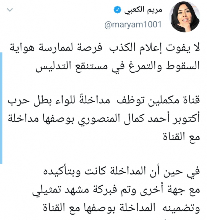 وأوضحت الكعبي في تغريدة لها عبر حسابها بتويتر ورصدها "المشهد العربي": "قناة مكملين توظف مداخلةً للواء بطل حرب أكتوبر أحمد كمال المنصوري بوصفها مداخلة مع القناة، في حين أن المداخلة كانت وبتأكيده مع جهة أخرى وتم فبركة مشهد تمثيلي وتضمينه المداخلة بوصفها مع القناة".