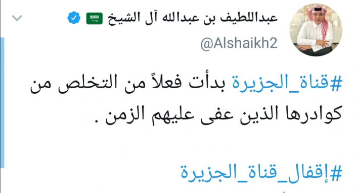 وكتب "أل شيخ" تغريدة عبر تويتر، رصدها "المشهد العربي": "قناة الجزيرة بدأت فعلاً من التخلص من كوادرها الذين عفى عليهم الزمن".
