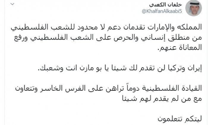 وكتب "الكعبي" تغريدة عبر تويتر، رصدها "المشهد العربي": "المملكة والإمارات تقدمان دعم لا محدود للشعب الفلسطيني من منطلق إنساني والحرص على الشعب الفلسطيني ورفع المعاناة عنهم".