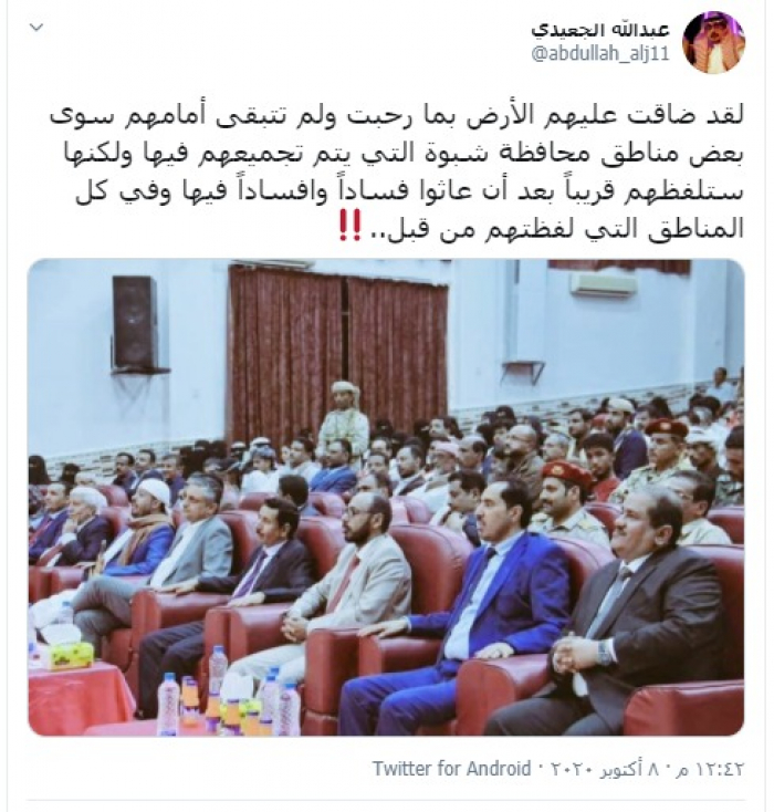 وكتب "الجعيدي" تغريدة عبر تويتر، رصدها "المشهد العربي": "لقد ضاقت عليهم الأرض بما رحبت ولم تتبقى أمامهم سوى بعض مناطق محافظة شبوة التي يتم تجميعهم فيها، ولكنها ستلفظهم قريبًا بعد أن عاثوا فسادًا وإفسادًا فيها وفي كل المناطق التي لفظتهم من قبل".