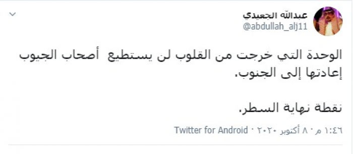وكتب "الجعيدي" تغريدة عبر تويتر، رصدها "المشهد العربي": "الوحدة التي خرجت من القلوب لن يستطيع أصحاب الجيوب إعادتها إلى الجنوب".
