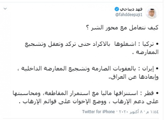 طرح المحلل السياسي السعودي فهد ديباجي، آلية للتعامل مع دول محور الشر (تركيا وإيران وقطر)، الداعمين للإرهاب العالمي.