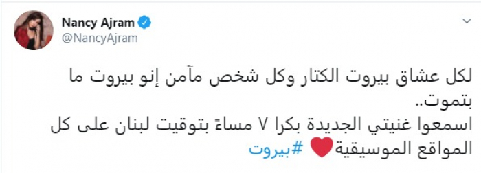 أعلنت النجمة اللبنانية نانسي عجرم، عن طرح أغنية وطنية جديدة من خلال تغريدة لها عبر "تويتر، قالت فيها "لكل عشاق بيروت الكتار وكل شخص مآمن إنو بيروت ما بتموت.. اسمعوا غنيتي الجديدة 7 مساءً بتوقيت لبنان على كل المواقع الموسيقية بيروت"، كما قالت في تغريدة أخرى: "إِنَّ كَونًا لَيسَ لُبنَانُ فِيهِ.. سَوفَ يَبقَى عَدَمًا أَو مُستَحِيلاَ.. #بيروت".