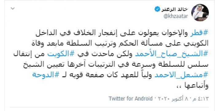 وكتب "الزعتر" تغريدة عبر تويتر، رصدها "المشهد العربي": "قطر والإخوان يعولون على انفجار الخلاف في الداخل الكويتي على مسألة الحكم وترتيب السلطة مابعد وفاة الشيخ صباح الأحمد، ولكن ماحدث في الكويت من انتقال سلس للسلطة وسرعة في الترتيبات آخرها تعيين الشيخ مشعل الأحمد ولياً للعهد كان صفعة قويه لـ"الدوحة وأتباعها".